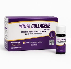 Description : Complément alimentaire à base d’extrait sec de pure membrane de coquille d’œuf, Source de Collagène naturel (protéine type I, V et X), élastine, acide hyaluronique, glucosamine et chondroïtine. L’extrait de Calendula et La vitamine E réparent et protègent les cellules de l’organisme. CURA+COLLAGENE soutient l’élasticité et fermeté de la peau, fortifie les cheveux et les ongles, contribue à la régénération du cartilage et renforce les articulations.
